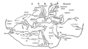 All that remains today however are generalized cosmogonic pictures derived from the theory that the world consists of countless spherical separate worlds. Our earth is one of the concentric rings in a disc detached from a globe, and all or part of the ring is inhabited. At the center is Mount Maga Meru, from which flow all rivers. The lists of peoples, cities and countries are pure invention, like later European maps of imaginary countries such as Cockaigne. There is a Buddhist map showing the world as a floating lotus-blossom, whose petals, stamens and pistils are covered with the names of countries, rivers, and so on, most of them invented. No one in India seems to have been interested in cartography, though we can surely assume the existence of other maps which answered the real needs of the people in conditions apparently favorable, notably the Indians’ remarkable sense of direction. Maps of native origin were brought to Europe from Burma and Nepal, but these were products of European influence, and any native character they may seem to have is due to their artists’ unfamiliarity with the pencils and paper provided by Europeans who may have been actually directing their work. India was long a closed country, and even if she did permit foreigners to enter, she herself did not trade with other countries. Indian religion (i.e., non-Moslem religion) did not permit the people to leave their country. Thus Indian geographers knew little about foreign countries, and the Brahman, or Jain cosmographies are full of imaginary peoples and lands.
