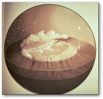“The surface of the vessel represented is the world which we inhabit. The mouth lies downward. In the hollow of the solid dwell the Earth-genii of Tartaros and the Spirits of the dead. Over it extends the compacted mass of Heaven, with its astral bodies. All this seems to have been adopted by Homer. But, moreover, the Chaldean Heaven rested upon columns, about which it revolved; these columns were not at the zenith of the heaven, which was immediately over Accad, but at the Mountain of the East [Northeast or North]. And even so Homer sets his heaven upon columns, but places them with his Atlas in the south.”