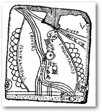 Despite the richness of civilization in ancient Babylonia and the recovery of whole archives and libraries, only a handful of Babylonian maps have so far been found. In Mesopotamia the invention by the Sumerians of cuneiform writing in the fourth millennium B.C. paved the way for the production of maps. They are impressed on small clay tablets like those generally used by the Babylonians for cuneiform inscriptions of documents, a medium that must have limited the cartographer’s scope. Other cuneiform tablets of the period between 2,500 and 2,200 B.C. include long lists of place-names, rivers and mountains. The text on these tablets, which were drawn from earlier sources that reached back as far as the beginning of the third millennium B.C., may have been used for teaching or perhaps military purposes, but whether they suggest the existence of maps is uncertain. The fact that King Sargon of Akkad was making military expeditions westwards from about 2,330 B.C. would account for the inclusion of places as far west as the Mediterranean. Later we encounter itineraries, referring either to military or to trading expeditions and provide an indication of the extent of Babylonian geographical knowledge at an early date. They do not go so far as to record distances, but they do mention the number of nights spent at each place, and sometimes include notes or drawings of localities passed through. As in Greek and Roman inscriptions, some documents record the boundaries of countries or cities.