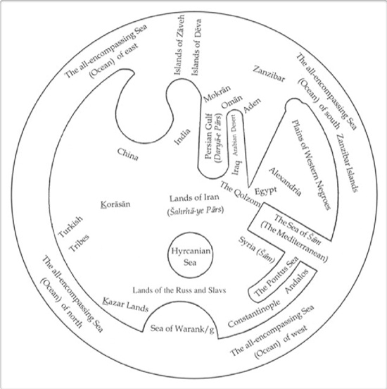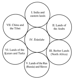 Similarly, the prologue to the Šāh-nāma of Abu Manṣur Moḥammad gives the following report by Qazvini from a source datable to about 620, when Sasanian troops had conquered Egypt: “the earth is divided into four directions (čahār-sūy) from one end to the other, and (also) into seven parts (haft bahr), each part of which they called a kešvar. The first is Arzah, the second Ša-bah, the third Faradadafš, the fourth Vidadafš, the fifth Vurubarst, the sixth Vurujarst, (and) the seventh, which is the center of the world, Ḵoniras-e bāmi (splendid Ḵoniras), and it is the one wherein we are, and the kings called it Ērānšahr.” The same text then enumerates the countries of the world, from China to the Byzantine Empire, in accordance with the four directions, and again comes to Ērānšahr, claiming that it “is from the river of Egypt [the Nile] to the Āmuya” and “surpasses in every art the other kešvars surrounding it”. Another elaborate Iranian scheme of the seven kešvars, similarly arranging known nations into six connected circles surrounding the central Ērānšahr was given by Abu Rayḥān Biruni, together with a sketch map, both reproduced by Yāqut. The Ketābal-tafhim, attributed to Biruni, and the anonymous Mojmal al-tawāriḵ give a simpler version of the scheme.
