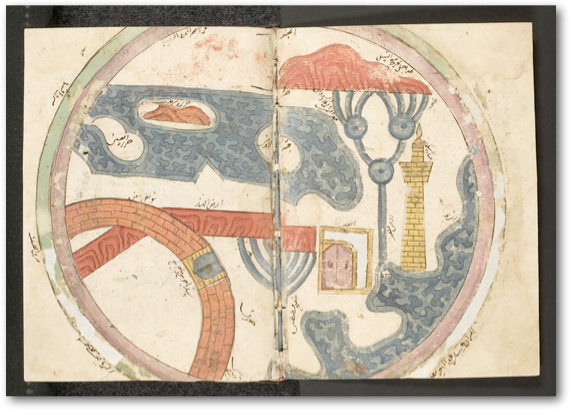 Only in the manuscripts in Paris and Heidelberg (fols. 258b-259a), a map of the world precedes the diagram of the Haft eqlim. Within the circle that marks the known parts of the world, the east is located on the left side. The map shows the wall of Gog and Magog and the Nile with its sources, as well as China, India, Sri Lanka (Jazira-ye Serendib), Europe (Afranja), and some important cities such as Jerusalem, Tangier, Alexandria (tower), and Mecca.