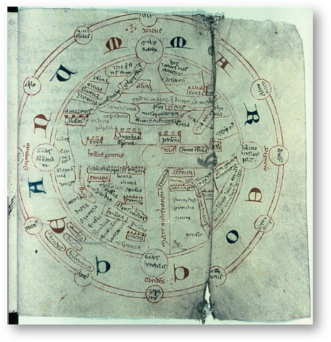 Oriented with East at the top, this map in a state intermediate between a T-O map and a mappamundi. Map with its center Delos, following a Greek tradition; the compass-drawn circle is the Cyclades, in French manuscript of Henry of Huntingdon, Ymago Mundi. The Mare Occeanum is a necklace of red and blue uncials. Late 13th century, 15 cm diameter, Oxford University, MS.e.Mus. 223, fol. 185r. (#205Z16)