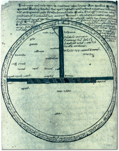 During the medieval age religious doctrine influenced cartography. European cartographers oriented their maps towards the Holy Land since Jerusalem was the place of Christ’s death and resurrection. In fact, the world “orient” comes from the Latin word “oriens”, meaning East. And there was a long stretch in the medieval era when most European maps were drawn with the East on the top. If there was any doubt about this move’s religious significance, they illuminated it with their maps’ pious illustrations, whether of Adam and Eve or Christ enthroned. Examples of maps with an east orientation are the mappamundi (Medieval European world maps) such as the T-O map. The T-O maps was a symbolic representation of the world, with the O representing boundary of the world, encircled by the earth’s oceans. The T nested inside the O divided the world into the Northern Hemispheres’ three continents: Asia at the top, Europe to the left, and Africa to the right (the southern hemisphere was ignored as it was considered inhabitable at the time). The horizontal bar of the T represented the Mediterranean Sea and the vertical portion of the T the Nile and Don Rivers. Heavily influenced by Christianity, European cartographers in medieval times oriented the maps so that east was at the top where the sun rose and the Paradise was thought to lie.