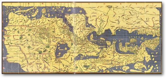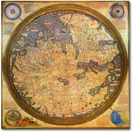 Some of the very earliest Egyptian maps show the South as up, presumably equating the Nile’s northward flow with the force of gravity. Arab mapmakers often drew maps with the south facing up, possibly because this was how the Chinese did it. Arab cartographers like Ibn Hawqal (Book IIB, #213) commonly use a South map orientation; in the 10th century he created a world map with South at the top. The Moroccan cartographer, Muhammad al-Idrisi, drew a world map in 1154 commonly known as Tabula Rogeriana (Book of Roger) for King Roger II of Sicily, showing south at the top of the map. In Europe, the famous Fra Mauro world map of 1459 employed a South orientation.