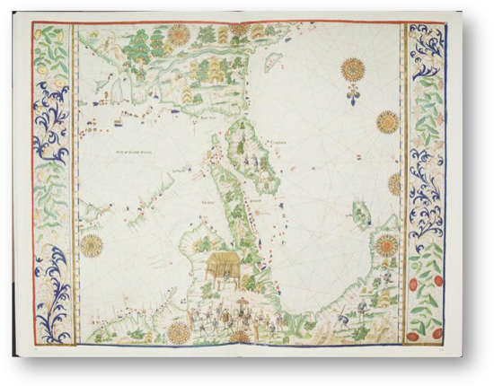 Beginning in the Mediterranean, somewhere between Europe and the Arab world in the 14th and 15th centuries, increasingly precise navigational maps of the Mediterranean Sea and its many ports called portolan charts appeared. They were designed for use by mariners navigating the sea’s trade routes with the help of a recently adopted technology, the compass. These maps had no real up or down — pictures and words faced in all sorts of directions, generally pointing inward from the edge of the map — but they all included a compass rose with north clearly distinguished from the other directions.