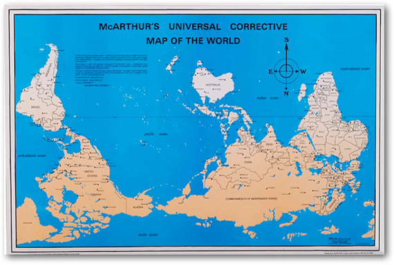 o Reversed maps, also known as Upside-Down maps or South-Up maps, reverse the “North is up” convention and have South at the top.