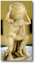 According to the scholar E.L. Stevenson, it is not easy to fix, with anything like a satisfactory measure of certainty, the beginning of globe construction; very naturally it was not until a spherical theory concerning the heavens and the earth had been accepted, and for this we are led back quite to Aristotle and beyond, back indeed to the Pythagoreans if not yet farther. We find allusions to celestial globes in the days of Eudoxus and Archimedes, to terrestrial globes in the days of Crates (#113) and Hipparchus. We find that the Greek geographer Strabo (#115) gives us quite a definite word concerning their value and their construction, and that Ptolemy (#119) is so definite in his references to them as to lead to a belief that globes were by no means uncommon instruments in his day, and that they were regarded of much value in the study of geography and astronomy, particularly of the latter science. There is, however, but one example known, which has come down to us from that ancient day, this a celestial globe, briefly described as the Farnese globe. It is of marble, and is thought by some to date from the time of Eudoxus, that is, three hundred years before the Christian era. The Farnese Atlas is a second century Roman marble copy of a Hellenistic sculpture of Atlas kneeling with the celestial spheres weighing heavily on his shoulders. It is the oldest extant statue of the Titan of Greek mythology, who is represented in earlier vase-painting, and more important, the oldest known representation of the celestial sphere. The sculpture is at the National Archaeological Museum (Museo Archeologico Nazionale) in Naples, Italy. It stands seven feet (2.1 meters) tall, and the globe is 65 cm in diameter.