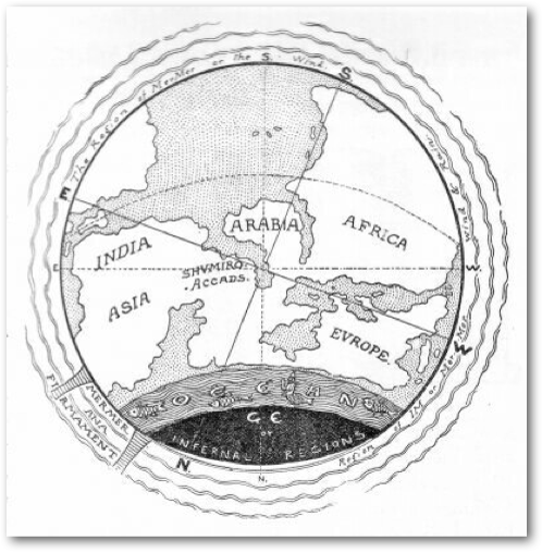 “Let us imagine then a boat turned over, not such a one as we are in the habit of seeing, but a round skiff like those which are still used, under the name of Kufa, on the shores of the lower Tigris and Euphrates, and of which there are many representations in the historical sculptures of the Assyrian palaces, the sides of this round skiff bend upwards from the point of the greatest width, so that they are shaped like a hollow sphere deprived of two-thirds (sic, for one-third, as the context shows) of its height, and showing a circular opening at the point of division. Such was the form of the earth according to the authors of the Accadian magical formulae and the Chaldean astrologers of after years. We should express the same idea in the present day by comparing it to an orange of which the top had been cut off, leaving the orange upright upon the flat surface thus produced.”